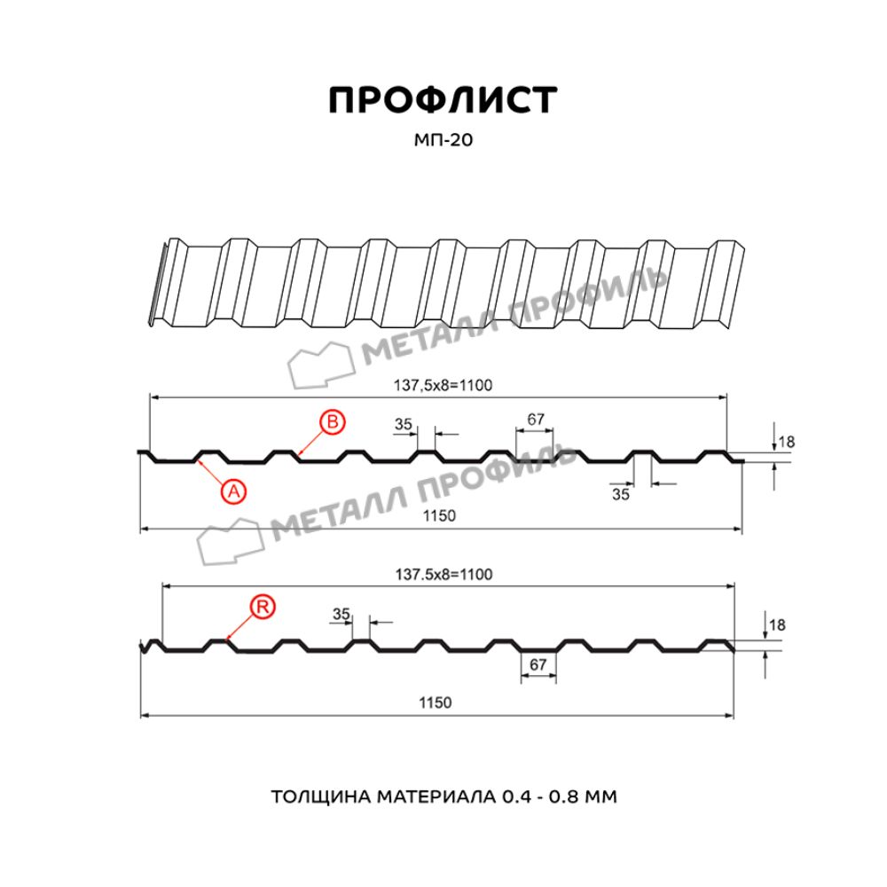Весьма популярный в Санкт-Петербурге профлист с умеренной глубиной гофры – 18 мм. Указанная в названии маркировка 20 – лишь округлённое число точного размера. Широкий выбор толщин, в которых возможен выпуск МП-20, а также его функциональные характеристики позволяют использовать этот профлист в самых различных областях. Металлопрокат 0,35-0,4 мм сгодится для обшивки фасада, поскольку несёт только декоративную функцию. Здесь имеет значение небольшой вес и защитное покрытие, придающее оттенок и фактуру материалу. Для монтажа кровельных скатов лучше брать профнастил с толщиной от 0,5 мм – он жёсткостью, чтобы выдерживать снег и потоки воды. Для установки забора оптимальным вариантом будет профнастил толщиной 0,4-0,5 мм. Более толстый профиль применяется уже в роли внутренних переборок в подсобных помещениях, для сборки каркасных конструкций (павильонов, гаражей, киосков).